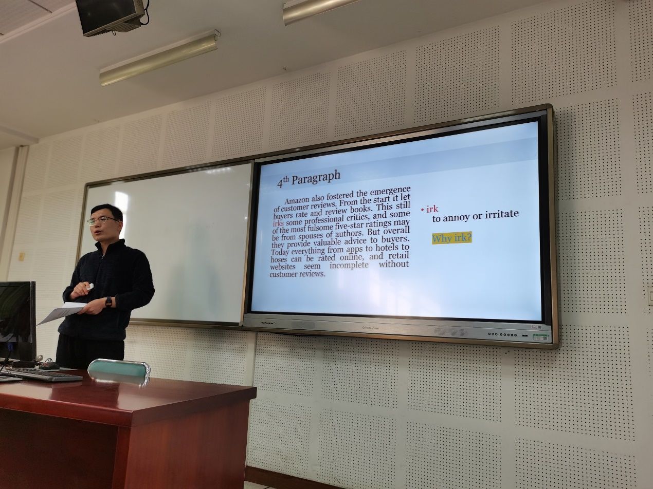 院网讯(通讯员 杨宇涵)为提高青年教师教育教学水平,加强青年教师队伍建设,外国语学院于11月18日下午两点在文波楼210语音教室举办了“第十届青年教师讲课竞赛”,各系部室选拔推荐的八名选手参加了比赛。本次比赛由外国语学院副院长袁奇主持,学校教学督导郭跃华、学院教学督导梁小华、来自各个专业的专家雷鸣、黄开胜、王璇出席本次比赛并担任评委。