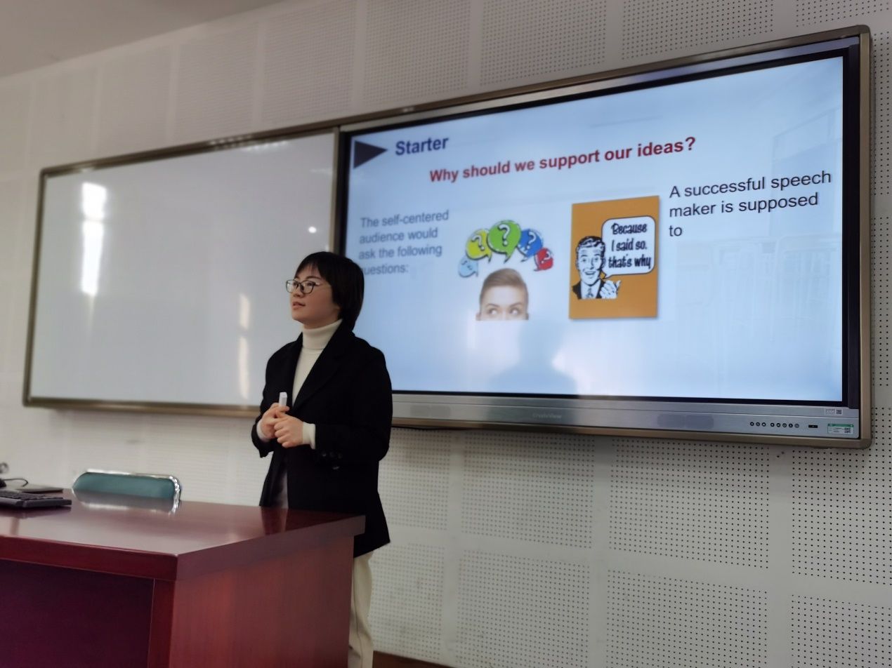 一号参赛选手王娜讲述了演讲的技巧(presentation skills),特别强调了在演讲中举例的重要性。