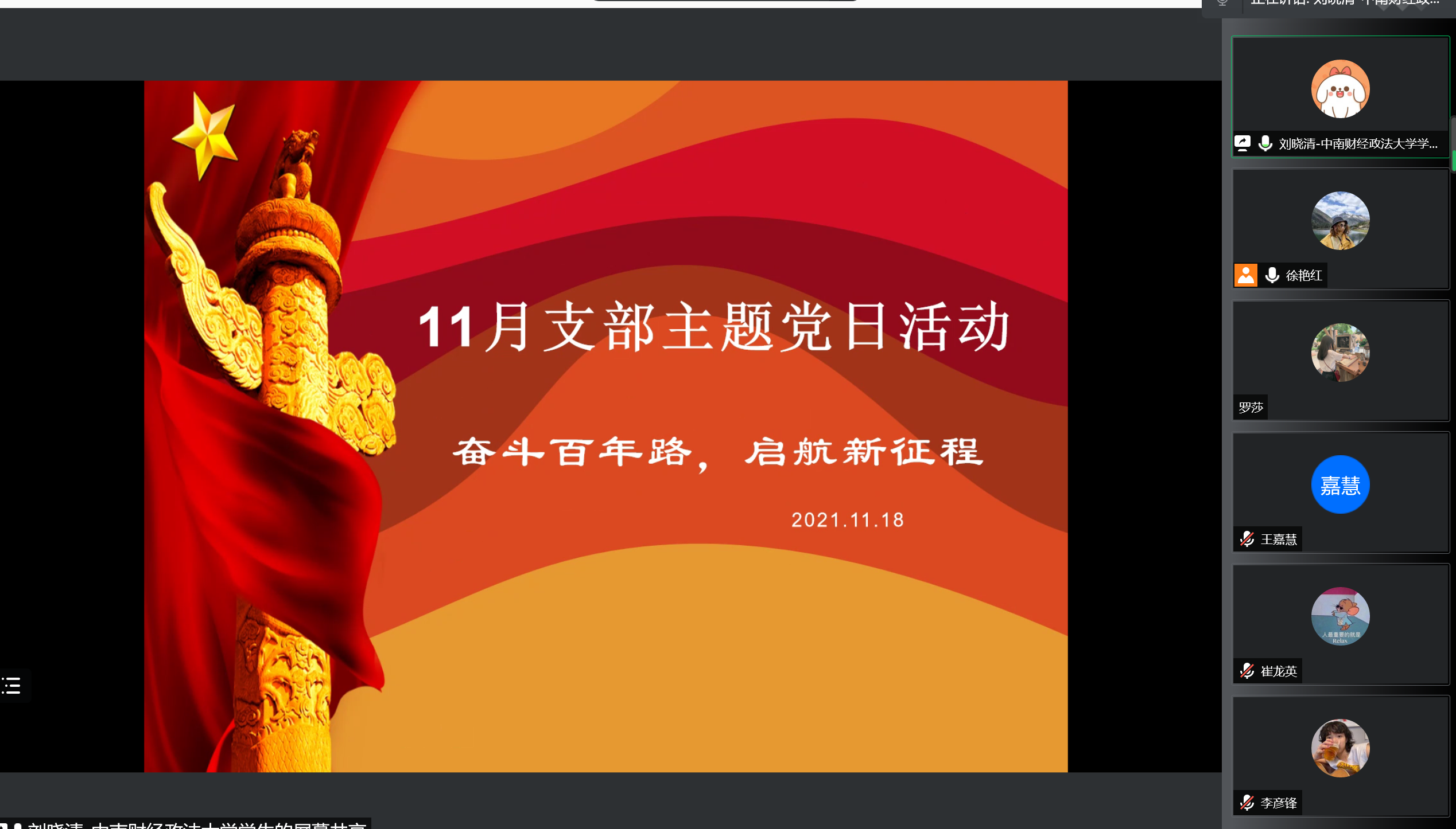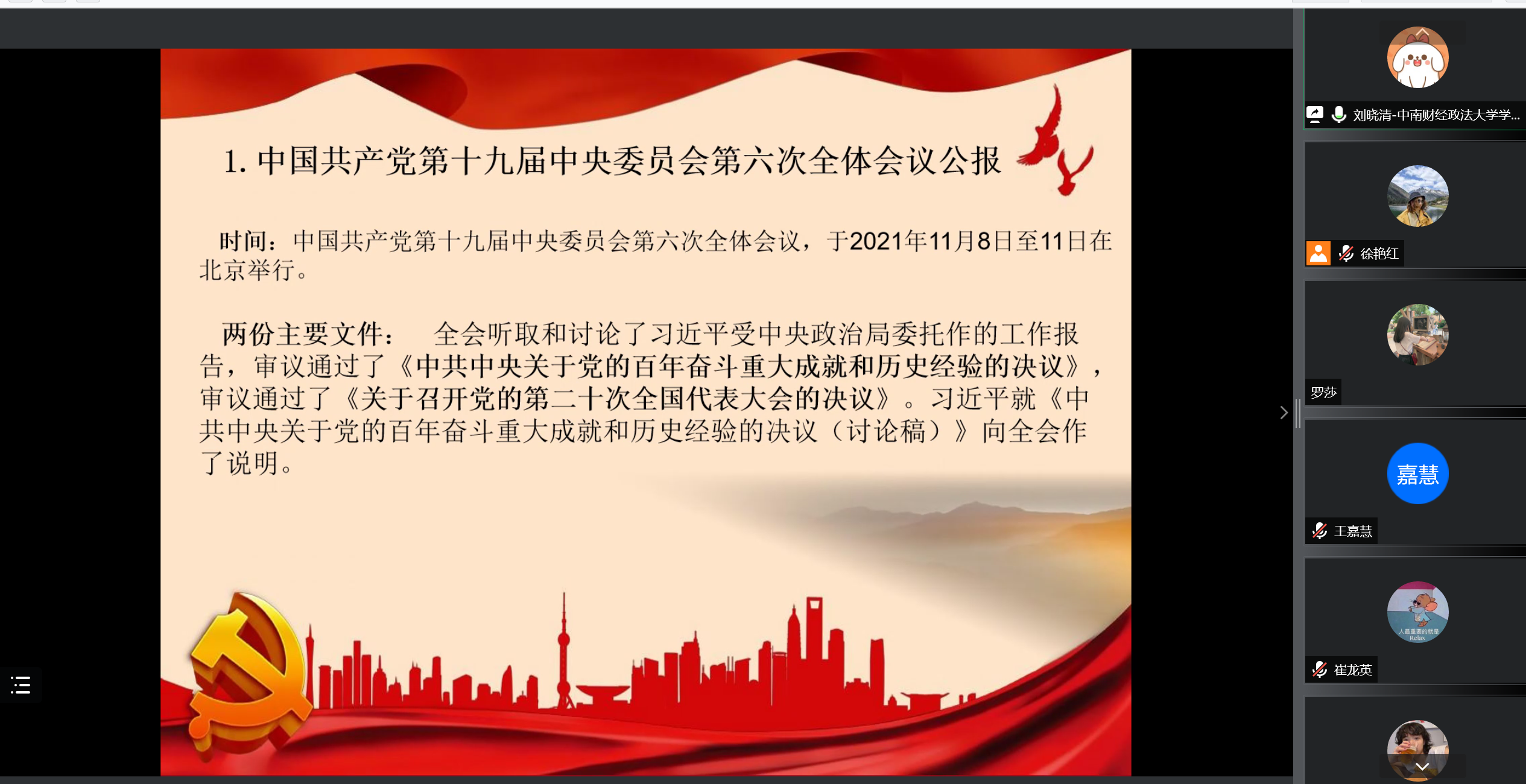 院网讯(通讯员:刘晓清)2021年11月22日晚上7点,外国语学院研究生党支部召开了2021年11月主题党日活动,集中学习党的十九届六中全会精神和习近平在中央人才工作会议上的讲话精神。会议的主要议程包括:重温入党誓词、深入学习党的十九届六中全会精神、深入学习习近平在中央人才工作会议上的讲话精神、深入开展学习讨论、集中交纳党费五个部分。2019级全体研究生党员参与会议,支部党员刘晓清主持会议。