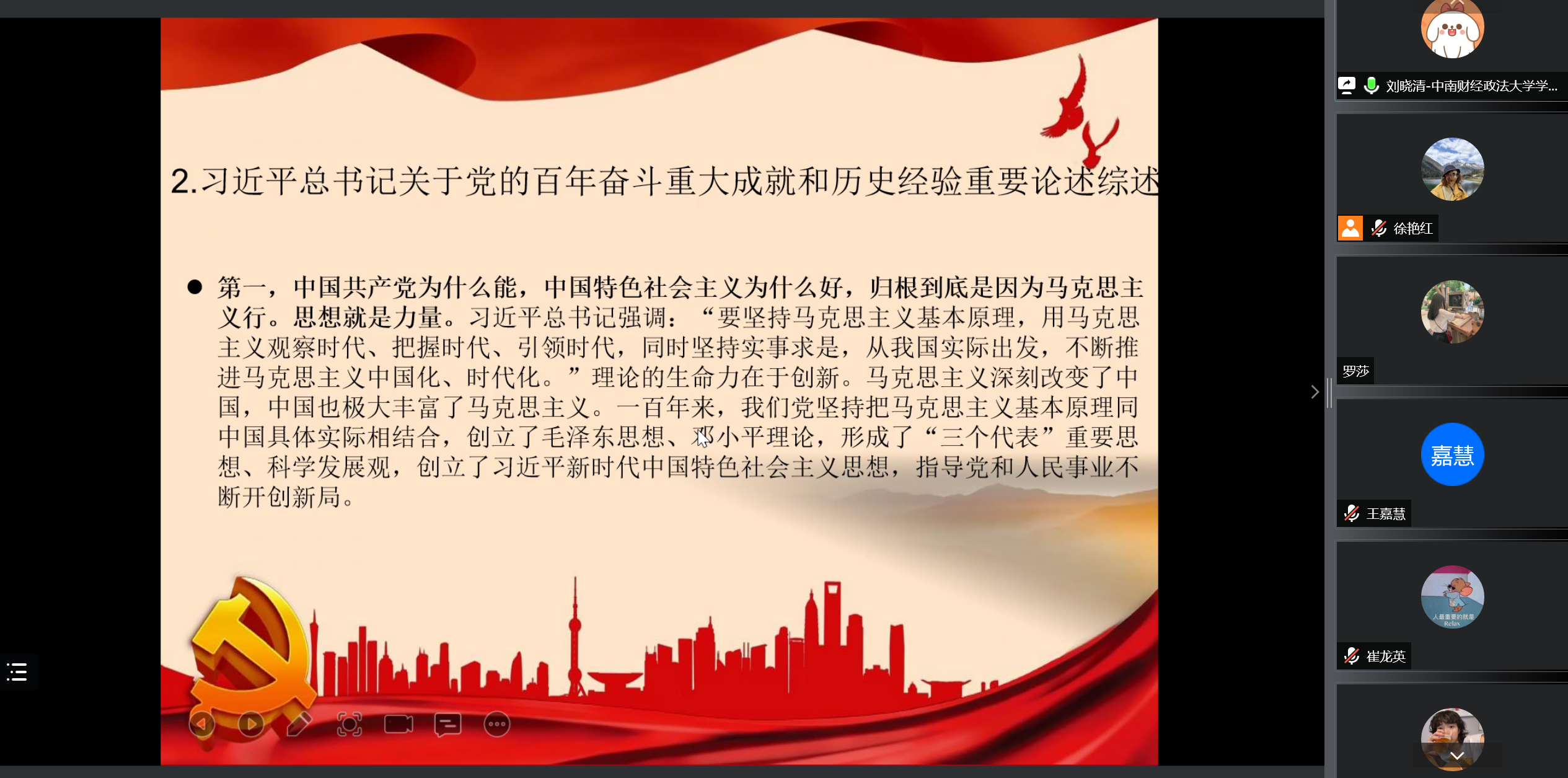 首先,在会议开始时,刘晓清同志带领全体党员同志共同学习了《中国共产党第十九届中央委员会第六次全体会议公报》的主要内容及本次会议通过的两份重要文件,即《中共中央关于党的百年奋斗重大成就和历史经验的决议》和《关于召开党的第二十次全国代表大会的决议》。