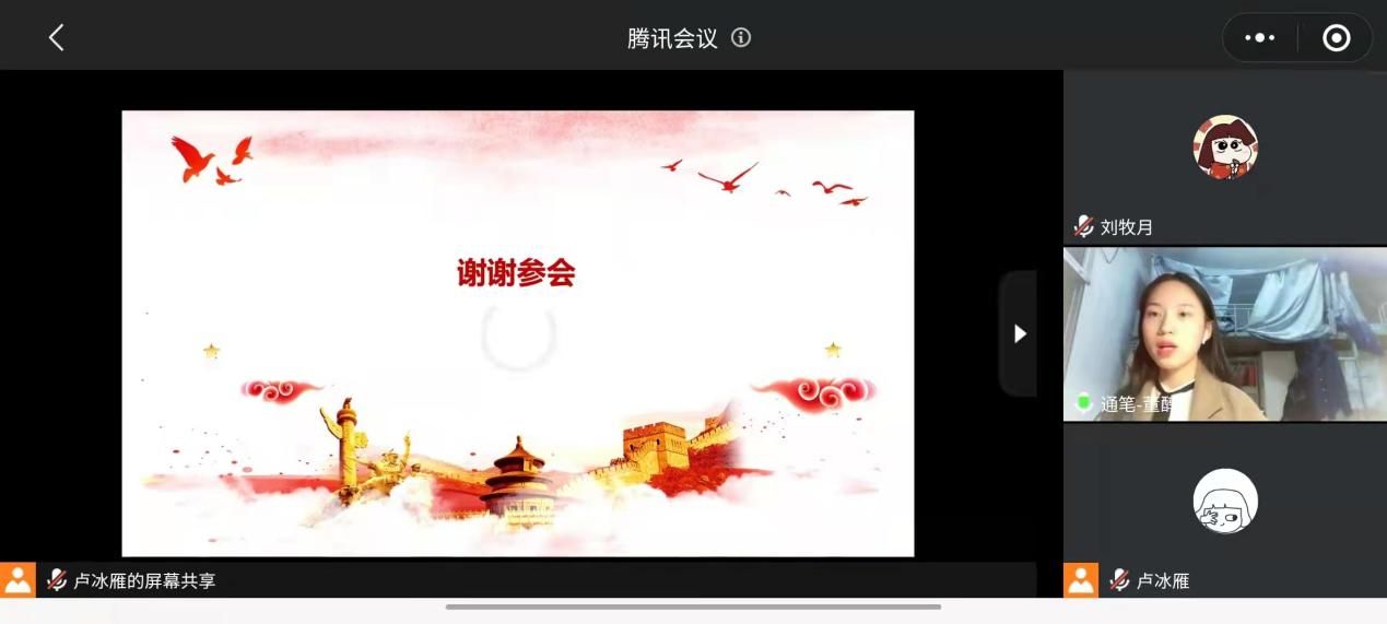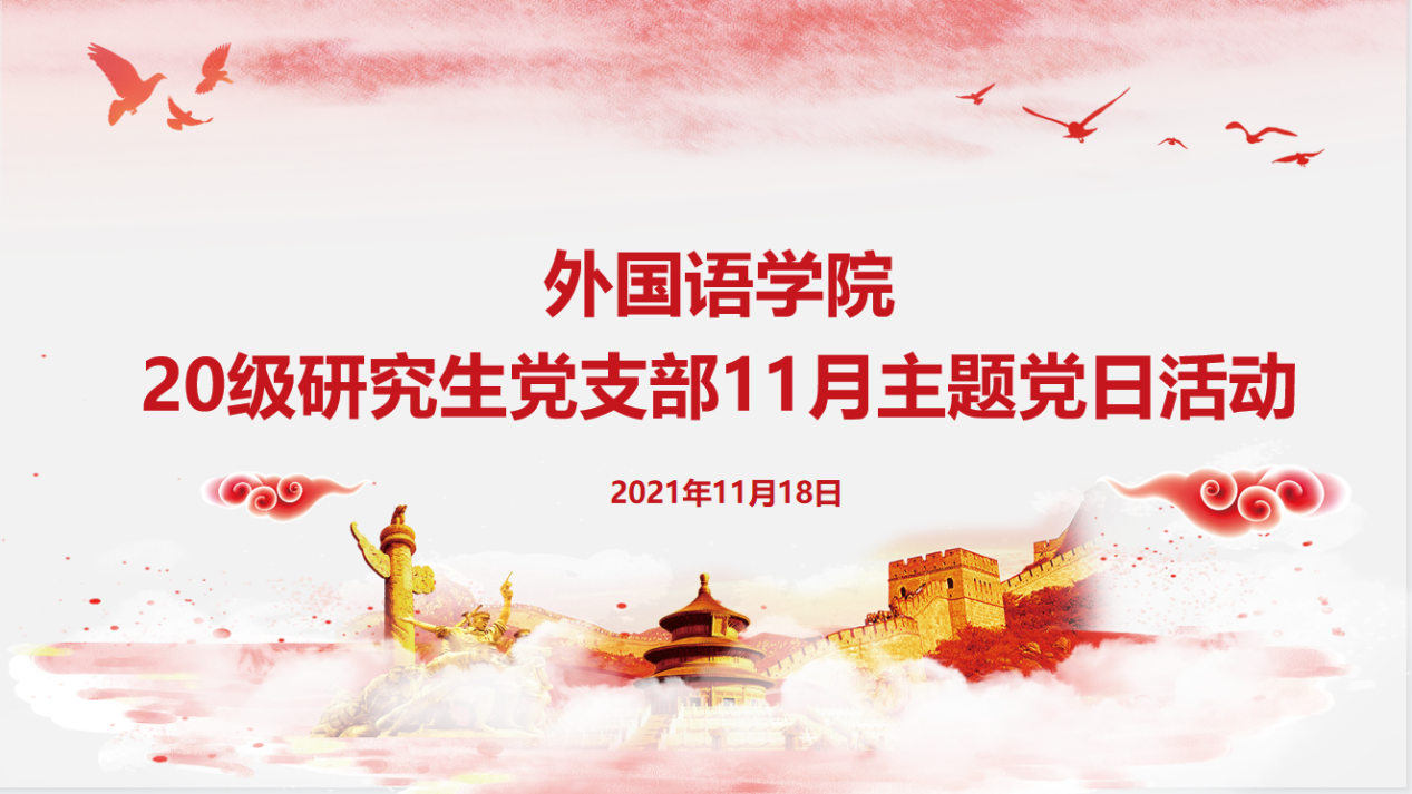 院网讯(通讯员 卢冰雁)2021年11月18日晚上,外国语学院2020级研究生党支部召开主题为“奋斗百年路 启航新征程”的11月主题党日活动暨多语种文献阅读活动。活动由2020级研究生党支部书记卢冰雁主持,支部全体党员参加学习活动,认真领会活动精神。