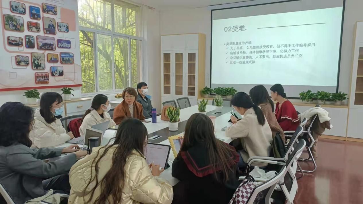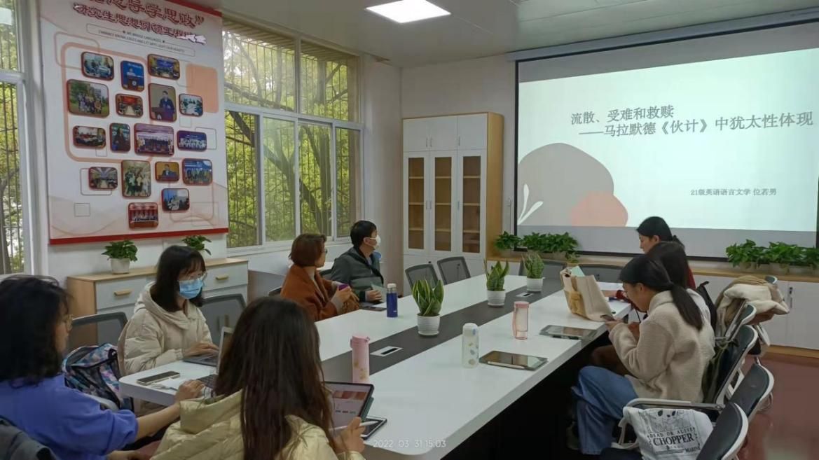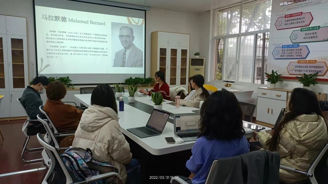 (通讯员 位若男)2022年3月31日,外国语学院英语语言文学导师组在学院学术研究中心201室开展书香下午茶活动。英语语言文学导师组王娜教授和2020级、2021级英语语言文学全体研究生以“流散、受难和救赎——马拉默德《伙计》中犹太性的体现”为主题,开展了一场生动的学术讨论。