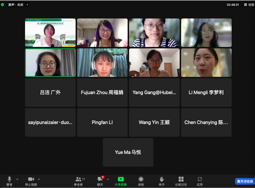本届新媒体翻译研究国际学术论坛由华中农业大学和湖北省翻译工作者协会联合主办,大家聚焦新媒体试听翻译理论与实践研究,共同推动翻译学科建设,讲好中国故事、提升中国国际传播力。论坛共设置2组主旨发言及8个分会场。英国伦敦大学Jorge Díaz-Cintas教授,伦敦大学Rocío Baños副教授,西班牙庞培法布拉大学Patrick Zabalbeascoa教授,德国肯普滕大学Iris Guske副教授,意大利罗马大学Irene Ranzato教授,西班牙庞培法布拉大学Patrick Zabalbeascoa教授,上海外国语大学肖维青教授及中国传媒大学麻争旗教授等国内外知名学者做主旨发言。8个分会场汇集了海内外几十位学者/学生踊跃参与,分享各自在AVT领域最新成果、教学和研究成果。孙昕昕同学在以新媒体翻译与无障碍传播研究为主题的分论坛上宣读了“人类命运共同体在美国的译介和传播”的文章,并与其他参会的学者跨领域、多维度进行交流和探讨。