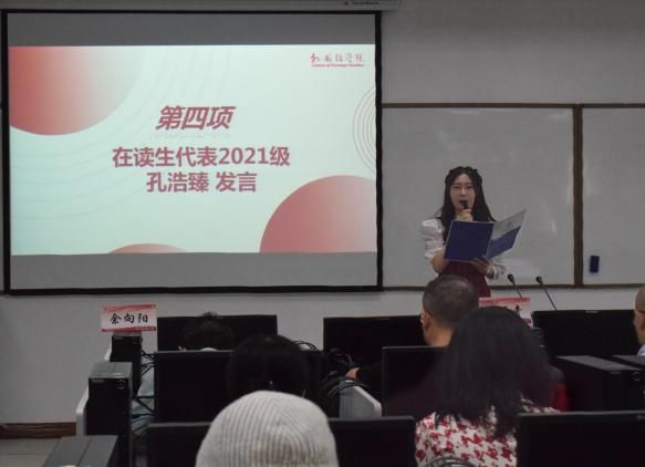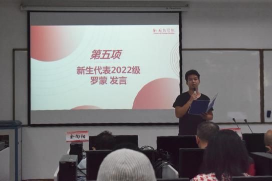 21级口译研究生孔浩臻同学、22级外国语言学及应用语言学罗蒙同学分别作为在校生代表和新生代表发言。孔浩臻同学分享了自己在中南大外院的成长心得。她说,作为外语学习者,要秉承对外语的热爱,脚踏实地的在语言学习的道路上不断探索,不断创新,从而实现远大的理想。罗蒙同学则随后分享了自身的学习过程和实践经历,并代表全体新生承诺,作为新时代青年,将立志高远,坚忍不拔,脚踏实地,共同携手,承载时代赋予的使命。