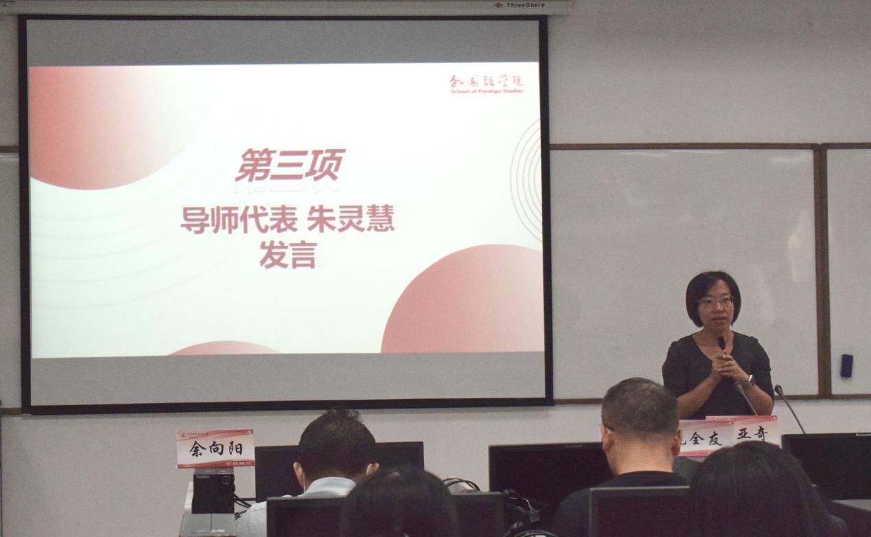翻译硕士导师朱灵慧教授作为导师代表发言,她结合自身多年的教学经验,为研究生新生提出了几点建议:一是要稳住心神,不懈努力,提高科学素养;二是要开拓思路,拓展领域,提升综合素养;三是要调整心态,自我培养,做一个全面发展的人。朱老师鼓励同学们主动学习,勤奋学习,快乐学习,成为有规划、有自控力、有温度的外院人。
