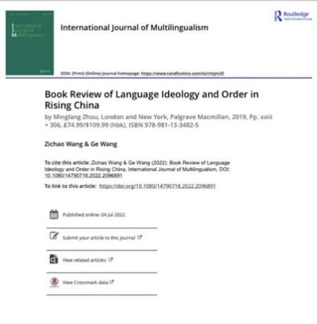 外国语学院20级外国语言学与应用语言学专业研究生王子超同学,在导师王革教授的指导下,与导师合作在教育语言学领域的权威国际学术期刊International Journal of Multilingualism(《国际多语期刊》)中刊发书评一篇,题为“Book Review of Language Ideology and Order in Rising China”(评《中国崛起中的语言意识形态与秩序》)。JCR2020数据显示,该刊为SSCI一区和A&HCI双检索期刊,IF影响因子2.714。