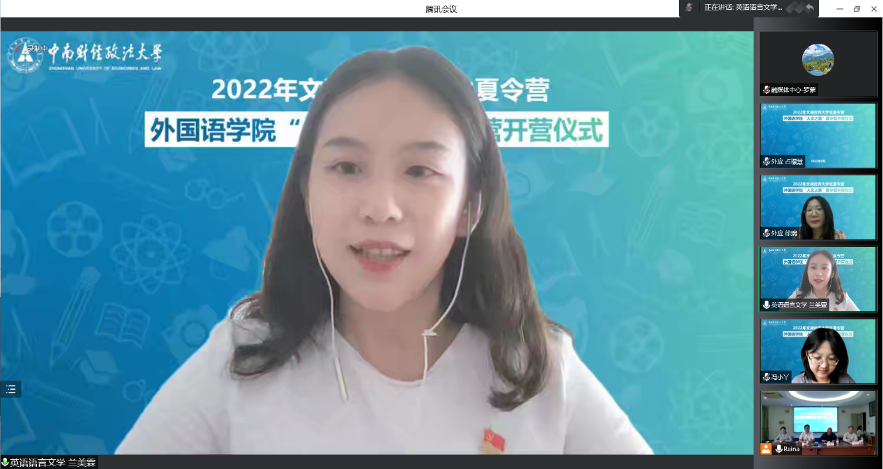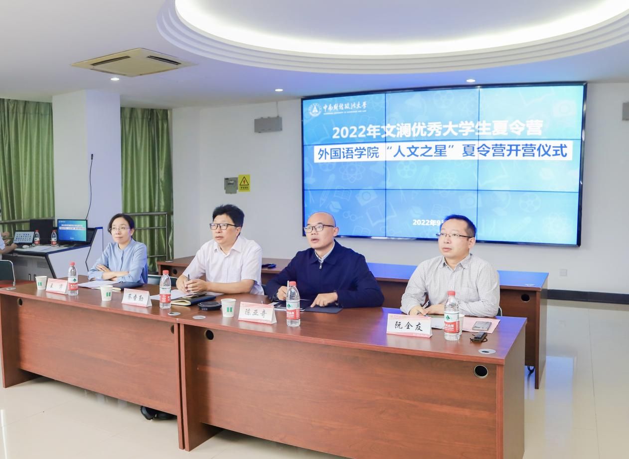 院网讯(通讯员 张冉 罗蒙)为给广大有志于报考中南大外国语学院硕士研究生的优秀学子搭建一个对话名师、展示自我的平台,2022年文澜优秀大学生夏令营“人文之星”分营于9月22日上午在文波楼会议室和腾讯会议同步拉开帷幕。院长蔡圣勤、党委书记陈亚奇、副院长阮全友、副书记王芹、研工办工作人员及全体营员参加开营仪式,仪式由王芹主持。为期一天的夏令营活动主要包括开营仪式、院情介绍、学术讲座、优秀营员面试考核等环节,活动吸引了来自全国50余所高校的66名同学报名入营。