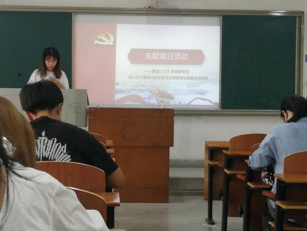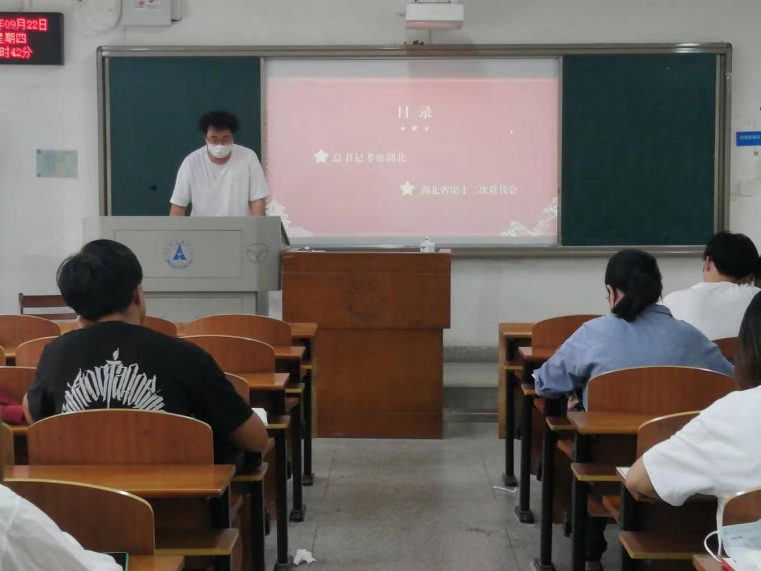 院网讯(通讯员 马玲)9月22日下午14:30,学院本科生党支部于文澜201教室开展以“喜迎二十大 永远跟党走——深入学习贯彻习近平总书记考察湖北重要讲话精神,推进落实湖北省第十二次党代会决策部署”为主题的9月份主题党日活动,本科生全体党员参与活动,2019级党员白晓珺主持本次活动。