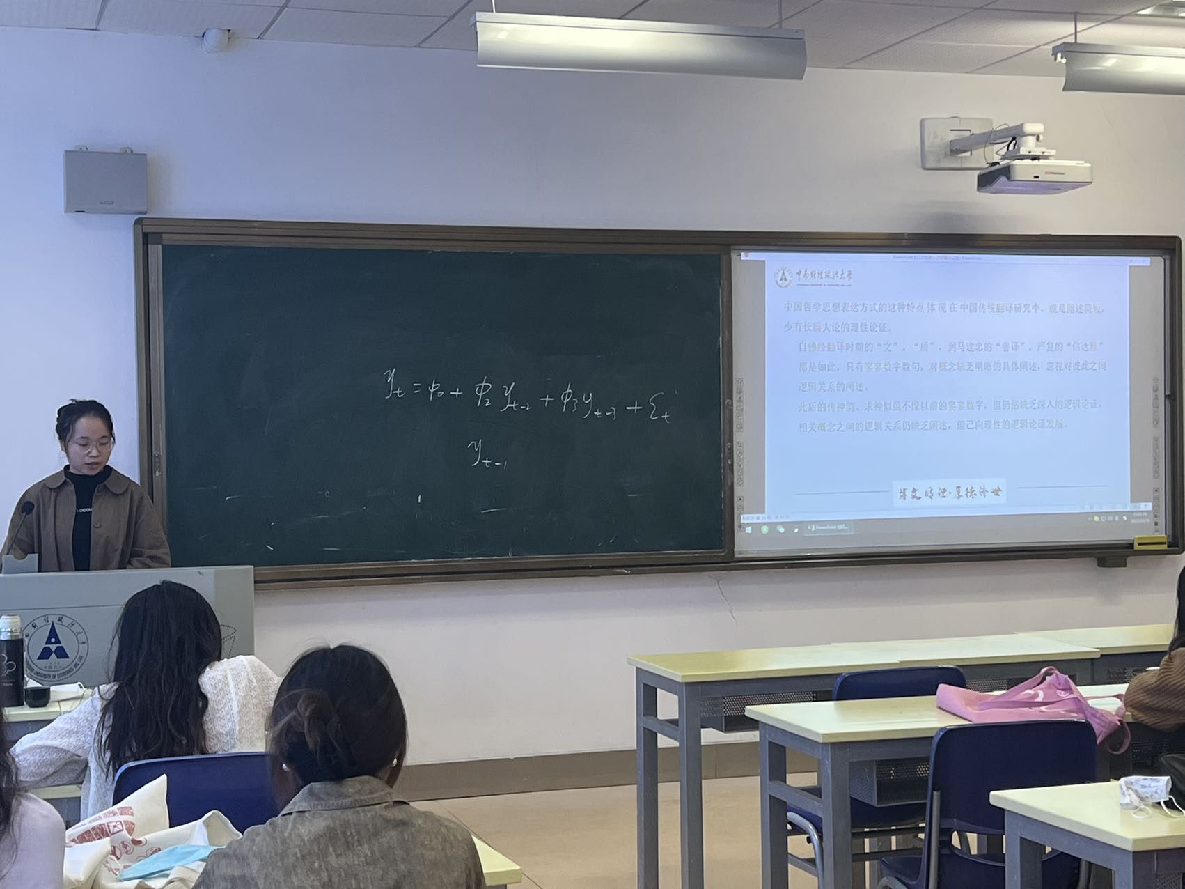 鲁新羽同学向我们展示了中西翻译标准思想差异之因。她认为,中西双方不同的哲学传统构成了中西方翻译标准思想差异的主要根源之一。首先,中国翻译标准中的“神似”、“神韵”正是受传统哲学重“悟”的影响;其次,中国哲学思想在表达方式体现为哲学家们的言说与著书往往都十分简短,甚至互不连贯。在翻译领域,比如自佛经翻译时期 的“文”、“质”,到马建忠的“善译”,严复的“信达雅”都是如此,只有寥寥数字数句,对概念缺乏明晰的具体阐述,忽视对彼此之间逻辑关系的阐述。由此,同学们对中西方翻译标准的差异及根源有了一定的认识。