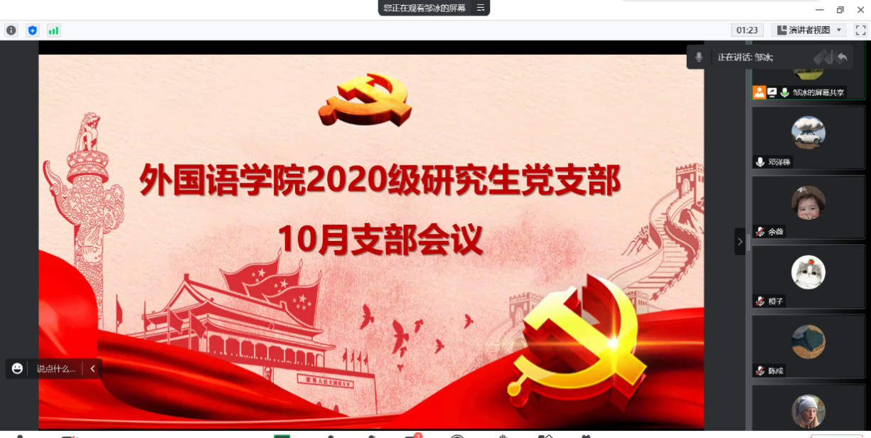 院网讯(通讯员:邹冰)为深入学习领会党的二十大精神,全面做好贯彻落实工作,10月25日晚上,外国语学院研究生第三党支部开展了“自信自强新时代 踔厉奋发新征程——深入学习宣传贯彻党的二十大精神”的主题党日活动。党支书邓泽锋与5名预备党员(邹冰、余薇、徐晨、李星雨、陈成)参加了支部会议。
