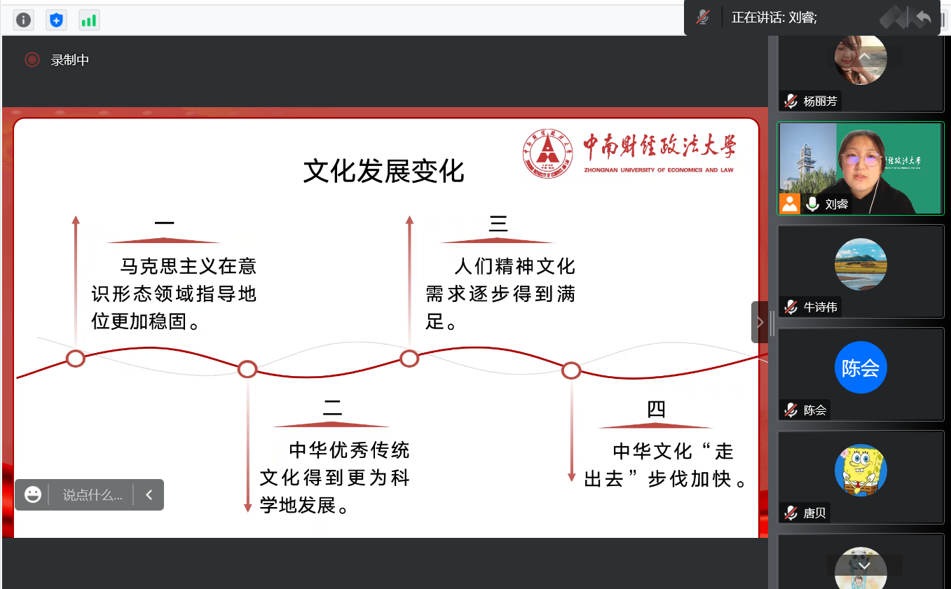 此次宣讲从文化自信、文化自强、文化发展变化以及如何铸就文化新辉煌这四个方面展开。结合党的二十大报告及十九大报告,刘睿对文化自信和文化自强进行了解读,带领党员同志们了解了中国的文化发展过程。同时,从外语专业及自身实际出发,一起感受中国人民文化自信逐步提升。中国国际地位日益提高,在国际文化舞台上发挥着越来越重要的作用。最后,刘睿带领支部成员一起结合青年实际,共同探讨了新时代青年应如何用自己的实际行动去铸就社会主义文化新辉煌。