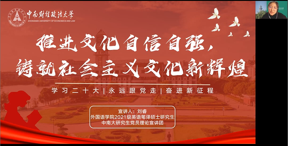 (通讯员 杨丽芳)11月18日晚,外国语学院研究生第二党支部开展了党的二十大文件精神专题学习活动,活动邀请了中南大研究生党员理论宣讲团成员、外院研究生第二党支部书记刘睿进行了名为“推进文化自信自强,铸就社会主义文化新辉煌”的宣讲。