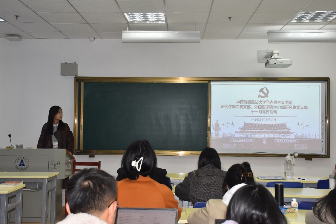 (通讯员 刘睿 胡烜硕 摄影 杨雪萍)11月24日晚,外国语学院研究生第二党支部与马克思主义学院研究生第二党支部在文澴楼201教室开展联合主题党日活动。本次活动以“守正创新担使命,勇毅前行谱新篇”为主题,两支部全体党员共同参与,会议由马克思主义学院研究生第二党支部书记李圣楠主持。