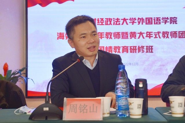 周铭山在致辞中表示,外国语学院党建与思想政治工作充分体现了学院语言多样、文化多元的学科特色,希望青年海外归国教师通过此次研修,不断完善自己,勇担为党育人、为国育才使命。结合党的二十大精神和学院教师特点,他对学院教师提出三点希望:一是要做好“经师”,将个人的教学科研与国家的形势政策结合起来;二是要成为“人师”,将个人的理想信念与国家的前途命运结合起来;三是要化身为“使者”,将个人的专业技能与国家的形象展现结合起来。