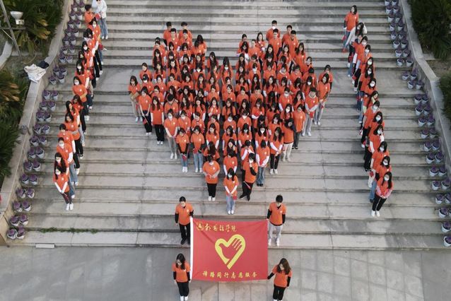 6日清晨,出席领导和老师们并排位于前列,学生们身着橙色短袖,站在台阶上列队摆成“中国青年志愿者标志”(心形),并在队前展开志愿服务活动旗帜,寓意传承雷锋精神和志愿服务精神。