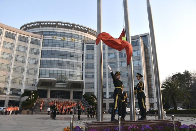 七点十分,升旗仪式正式开始。国旗护卫队队员们步伐整齐、昂首挺胸护送五星红旗进场;全体人员合唱国歌,鲜红的国旗伴随着嘹亮的歌声冉冉升起。
