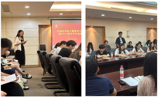 院网讯(通讯员:陈姿言)为深入开展学习贯彻习近平新时代中国特色社会主义思想主题教育,全面把握学生的思想动态,充分调研学生的学习生活情况,切实解决学生的急难愁盼问题,6月8日下午,外国语学院于中南楼412会议室召开主题教育专题调暨2022级学生代表座谈会,院党委书记陈亚奇,院党委副书记余向阳,各专业教师代表,院党政办主任,学办教师代表,英语、商法 (双)、法语、日语、俄语等专业2022级学生代表22人参加此次座谈会。