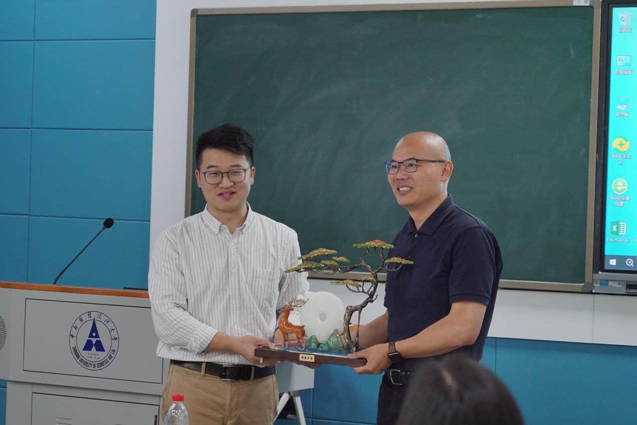 校友代表鲍喜周向外国语学院赠送“逐鹿中原”纪念品,表达对母院的祝福。