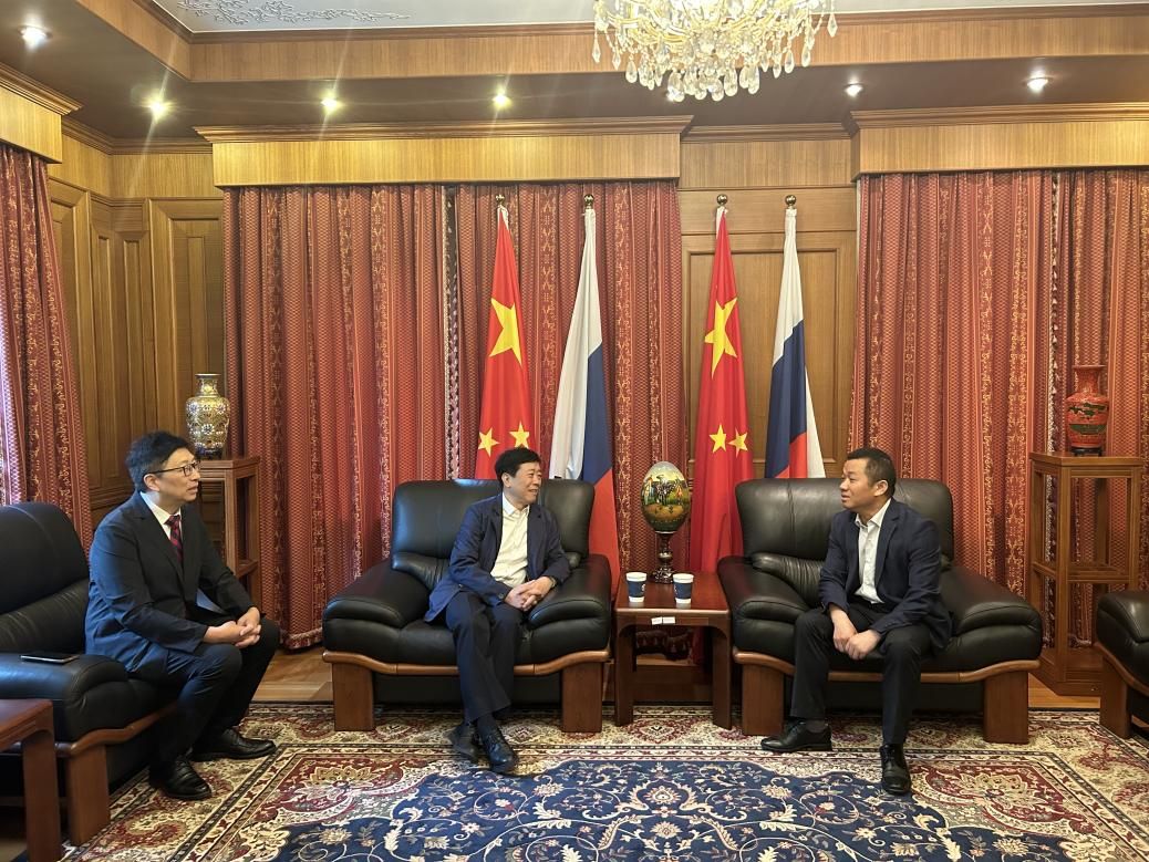 6月24日,代表团前往中华人民共和国驻俄罗斯联邦大使馆,与教育参赞蒋中亮展开深入会谈。蒋中亮对学校的来访表示热烈欢迎,对学校近年来对俄教育交流成果给予充分肯定,并介绍了新形势下俄罗斯高等教育办学特点和发展趋势。申祖武介绍了学校在国家“一带一路”倡议背景下持续推进智库建设、涉外人才培养以及学科融合方面所开展的主要工作和取得成效,并阐述了“传统学科+数据走向现代化,优势学科+外语走向国际化”的学科发展思路。