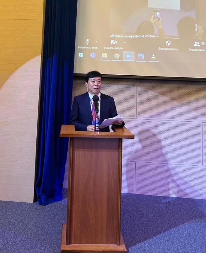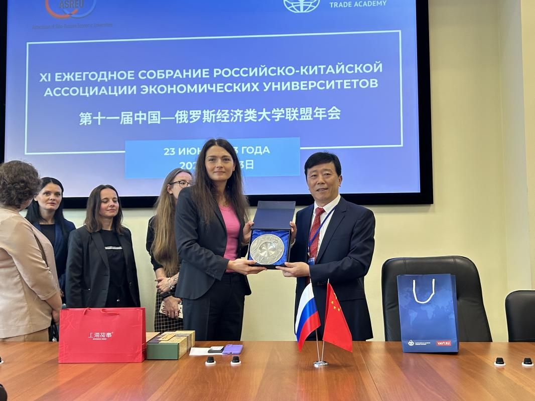 6月23日,代表团全程参加了中俄经济类大学联盟第十一届年会,并作主旨发言。本次年会由俄罗斯联邦经济发展部全俄对外贸易学院承办,共有来自中俄两国18所高校参会。会前,申祖武与全俄外贸学院代理校长维多利亚·伊德里索娃(Виктория Идрисова)会谈,并互换校礼。会上,申祖武作了题为《深化高等教育交流合作 共建中俄教育美好未来》的主旨发言,介绍学校对俄教育交流概况。他结合学校办学实际,对联盟未来发展提出三点建议:一是进一步丰富合作形式,创新教育合作机制;二是进一步深化教育合作层次,推进双向留学提质增效;三是进一步发挥学科优势,为中俄经济合作提供智识支持。会后,代表团还分别会见俄罗斯普列汉诺夫经济大学管理学院副院长马克西姆·波诺马廖夫(Максим Пономарев),俄罗斯联邦政府财经大学国际合作处处长普里霍德科·莉莉娅(Лилия Приходько),副处长阿列克谢·谢列达(Алексей Середа)。