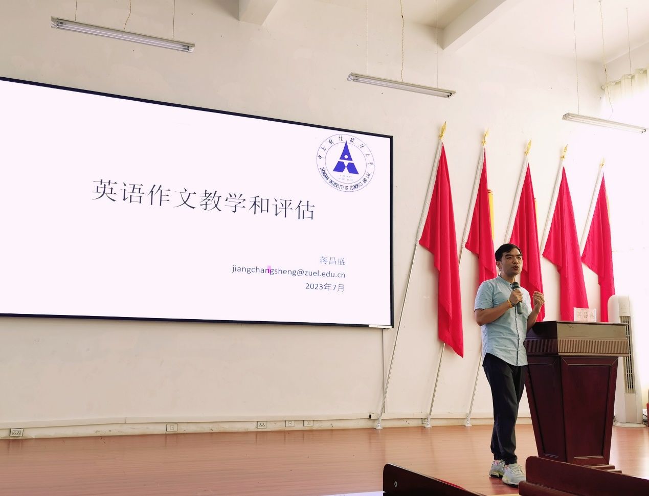 蒋昌盛的报告题为《英语大作文评估与教学》,通过现场提问调查盐津中学教师的作文教学与评估现状,以盐津三中某同学的英语大作文为范例,向教师们展示英语大作文写作的重点要点与难点痛点,深入剖析教师们在英语作文教学中的潜在误区与可行策略,并分享易得易用的互联网英语教学资源。