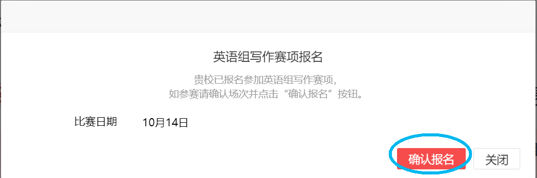 选手填完基本信息后,请点击相应比赛报名按钮,进入报名弹窗,点击“确认报名”,方视为报名成功。下面以英语组写作赛项为例展示报名流程。