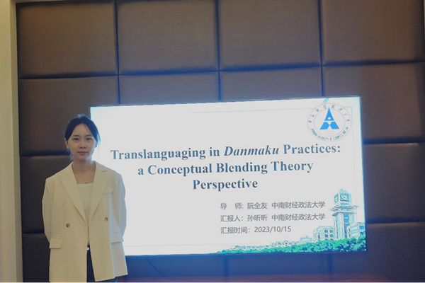 学院21级外国语言学及应用语言学专业研究生孙昕昕参会宣读论文《Translanguaging in Danmaku Practices: a Conceptual Blending Theory Perspective》,她的研究基于视频网络弹幕交流语言中的超语现象,从认知语言学概念整合理论视角分析了青年亚文化中独具特色的超语实践及其形成路径和理论机理,得到了来自北京外国语大学、四川大学专家和与会学者的积极评价。他们高度肯定了此项研究,认为研究选题独具创新性,研究方法具备跨学科意义,研究思路清晰,具有很好的研究价值。