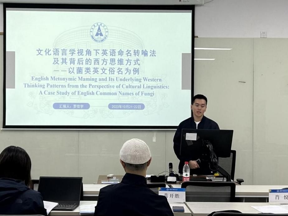 2022级研究生罗佳宇以《English Metonymic Maming and Its Underlying Western Thinking Patterns from the Perspective of Cultural Linguistics: A Case Study of English Common Names of Fungi》为题进行了汇报,该研究分析了菌类英文俗名命名过程中的转喻机制,探究背后的思维方式等文化因素,以及这些因素对认知语言学、文化语言学和外语教育等的意义。