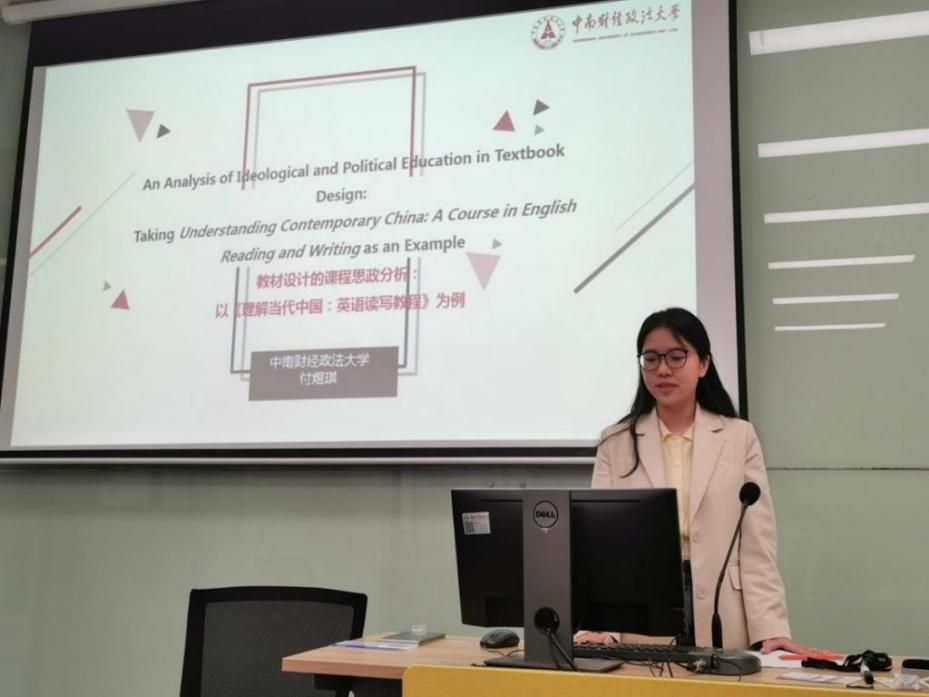 2021级研究生付煜琪报告的题目是《Ideological and Political Education in Textbook Design: Taking Understanding Contemporary China: English Reading and Writing Course as an Example》。她的研究聚焦“理解当代中国系列教材”,重点研究教材设计中的思政元素,思政元素的呈现情况与特点,以及这些思政元素与教学活动设计理念之间的关系。