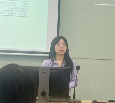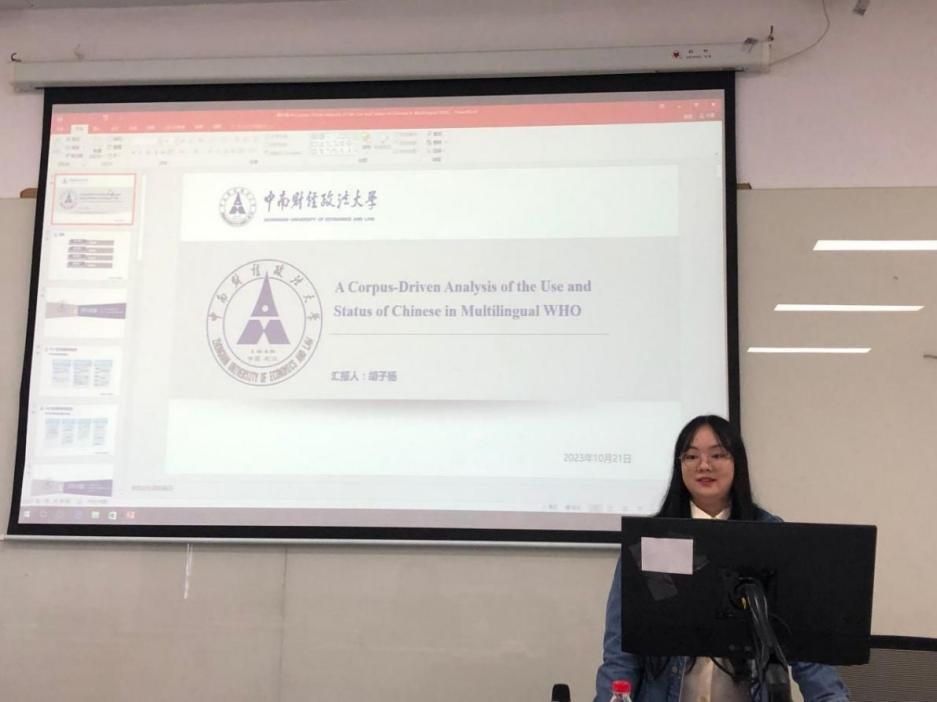 2022级研究生胡子杨以《A Corpus-Driven Analysis of the Use and Status of Chinese in Multilingual WHO》为题进行了汇报,她的研究分析了中文在世卫组织多语治理下的使用现状及影响力,并推测其影响因素,以扩大中文在国际组织中的影响力。