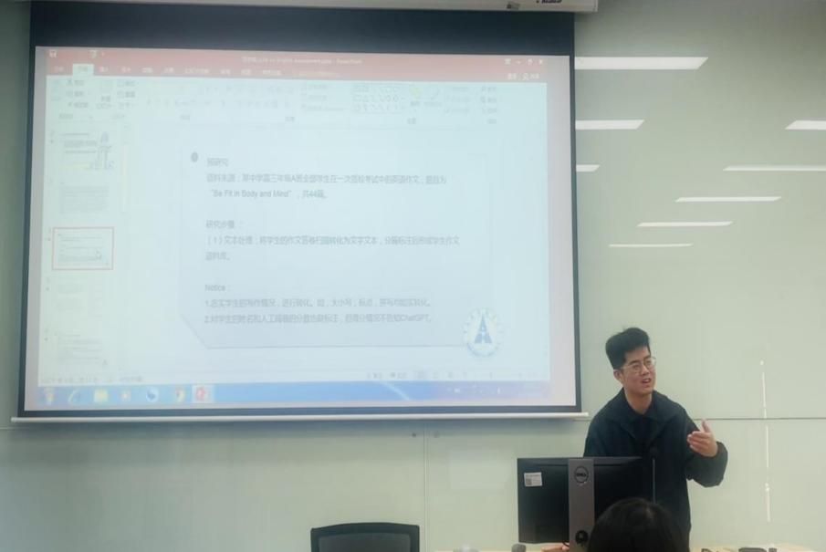 2021级研究生范宇铭的汇报题目是《The Application of Large Language Models in High School Students’ English Writing Assessment: A Case Study of ChatGPT》。他以高中英语学生的作文评估为切入点,深入探讨了大语言模型在写作评估方面的质效,并展示了他所总结的两类测评主体的归分模型。