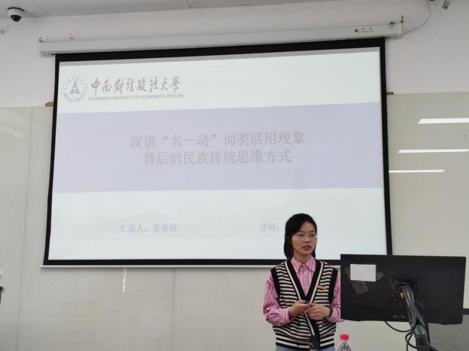 2022级研究生黄嘉利的汇报题目为《A Study on the Motivation of the Traditional Thinking Mode of Han Nationalityof Chinese “Noun-Verb” Shift from the Perspective of Embodied Linguistics》,她通过分析汉语“名—动”词类活用产生的条件、现实—认知—语言三者之间的关系及现象背后的民族思维原因,有助于了解汉民族思维对于汉语使用的重要作用。