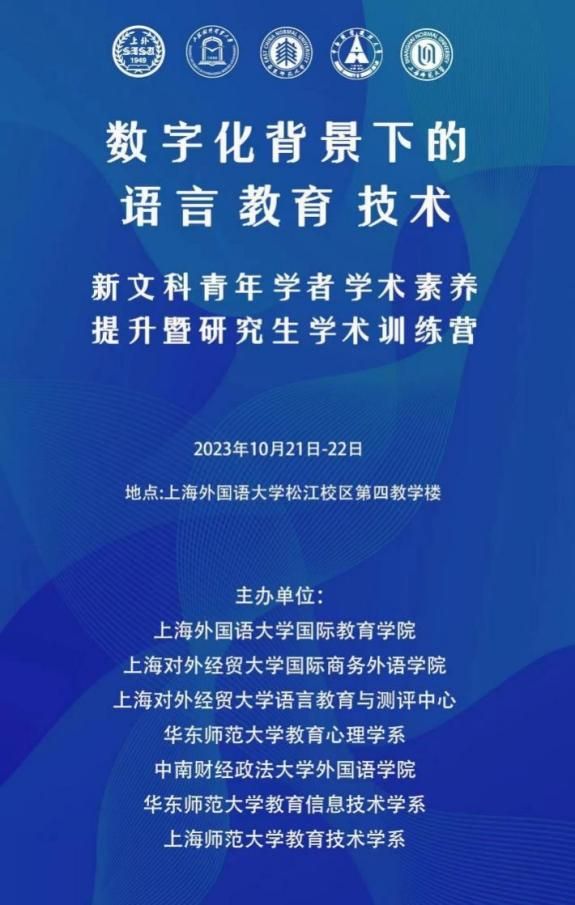 (通讯员 罗蒙)10月21-22日,专家学者齐聚上海外国语大学,共享“数字化背景下的语言、教育、技术——新文科青年学者学术素养提升暨研究生学术训练营”盛会。活动由上海外国语大学国际教育学院、上海对外经贸大学国际商务外语学院、上海对外经贸大学语言教育与测评中心、华东师范大学教育心理学系、米兰电竞·(中国区)外国语学院、华东师范大学教育信息技术学系和上海师范大学教育技术学系联合举办,共有170余名专家学者及研究生参与。副院长阮全友、ESP与法商英语研究所所长黄开胜出席活动,学院十位研究生参会并作报告。