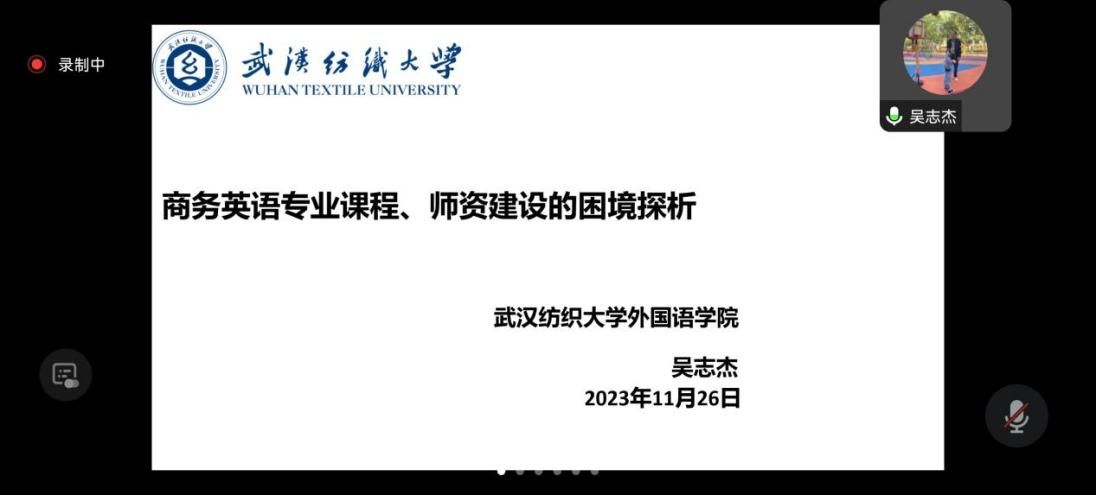 武汉纺织大学外国语学院商务英语专业教研室主任吴志杰副教授在发言中回顾了武汉纺织大学商务英语专业前些年的努力与成就,介绍了武汉纺织大学商务英语专业经过6年的建设与发展,基本形成了完整的课程体系,也确立了明确的专业发展方向,但同时也存在着一些问题,尤其是在课程设置与师资建设方面的问题,同时也介绍了解决办法。
