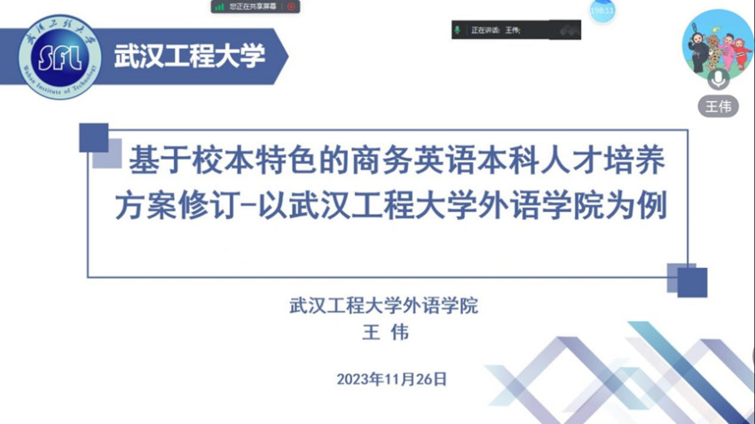 武汉工程大学外国语学院英语专业教研室主任王伟副教授在发言中提出,人才培养中要深化教育教学改革,创新人才培养模式,大力提升本科人才培养质量。他介绍了武汉工程大学外国语学院基于理工科院校和强势学科的校本特色,通过广泛的调研和反馈,对商务英语本科专业人才培养方案进行修订的情况。