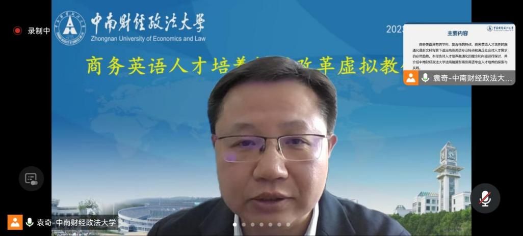 上午八点半,线上教研活动正式开始。首先由中南财经政法大学外国语学院院长蔡圣勤教授致辞,他在讲话中强调,随着全球化加速与经济持续发展,传统的人才培养模式已经无法满足当今社会对商务英语人才的需求,借助于信息化技术打造出的虚拟教研室,旨在为老师同学们提供一个更便捷的思想交流平台,有利于推动商务英语人才模式改革和创新发展。