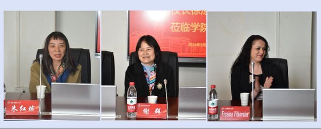 教师代表发言环节,谢群教授表示很荣幸能作为教师代表参加此次会议,感谢学校与学院对工作的支持与帮助,希望今后学院能在国际交流合作中为学校贡献新的成绩;朱红琼教授感谢学校对于俄语专业的支持;外教Vitkovska Frosina(方唯)副教授感谢学校与学院对马其顿语言与文化通选课程建设的关心。