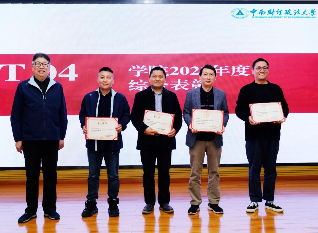 会上,院领导先后为2023年外国语学院综合表彰评选中获得优秀科研奖的曹宇、雷鸣、朱勇、王革四位老师,获得优秀教学奖的冯曼、夏正华、袁奇、张琦四位老师,以及获得优秀育人奖的张琦和张冉两位老师依次分别颁奖并合影留念。