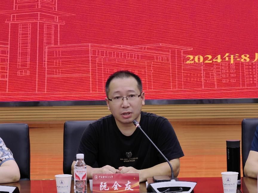 副院长阮全友介绍了本学期本科生教学工作安排,并强调了新学期开学的注意事项,如查看课表时间地点、做好教学检查周课堂巡查工作、上好开学第一课等。
