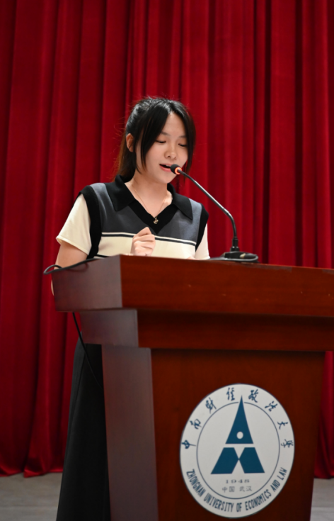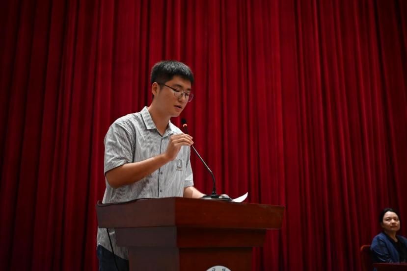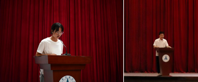 新生代表外国语言文学专业王紫芸和俄语专业杜飞相继发言,王紫芸引用英文名句:Life isn’t about waiting for the storm to pass .It’s about learning to dance in the rain .以此表达自己作为一名中南大人,将会在未来的学习中,坚持自信自强、守正创新、着力奋发、勇毅前行的二十大精神。杜飞表示,纵使前路漫漫而修远,作为外院新生,我们要不忘初心,不移其志。
