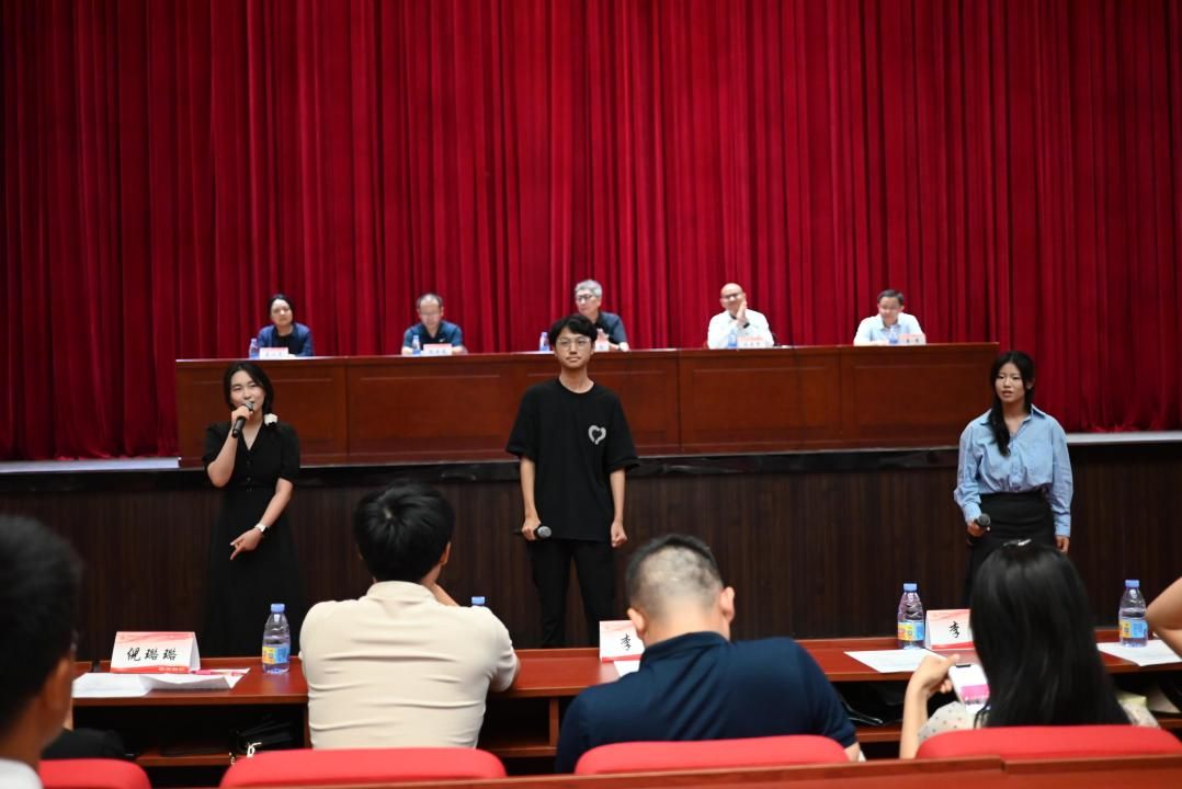 商务英语2102班董怡琳、俄语2101班李乾铭先后代表在校生发言。董怡琳从兴趣、坚持与努力三方面介绍大学的学习情况,并向师弟师妹们提出三点期待:从单纯知识学习到躬身实践转变,从被动学习向主动学习转变,从服从型人生向主导型人生转变;李乾铭在演讲中寄语学弟学妹:无论大家学习哪种专业,都请保持好奇心,勇于探索未知,勇于尝试,不畏失败。