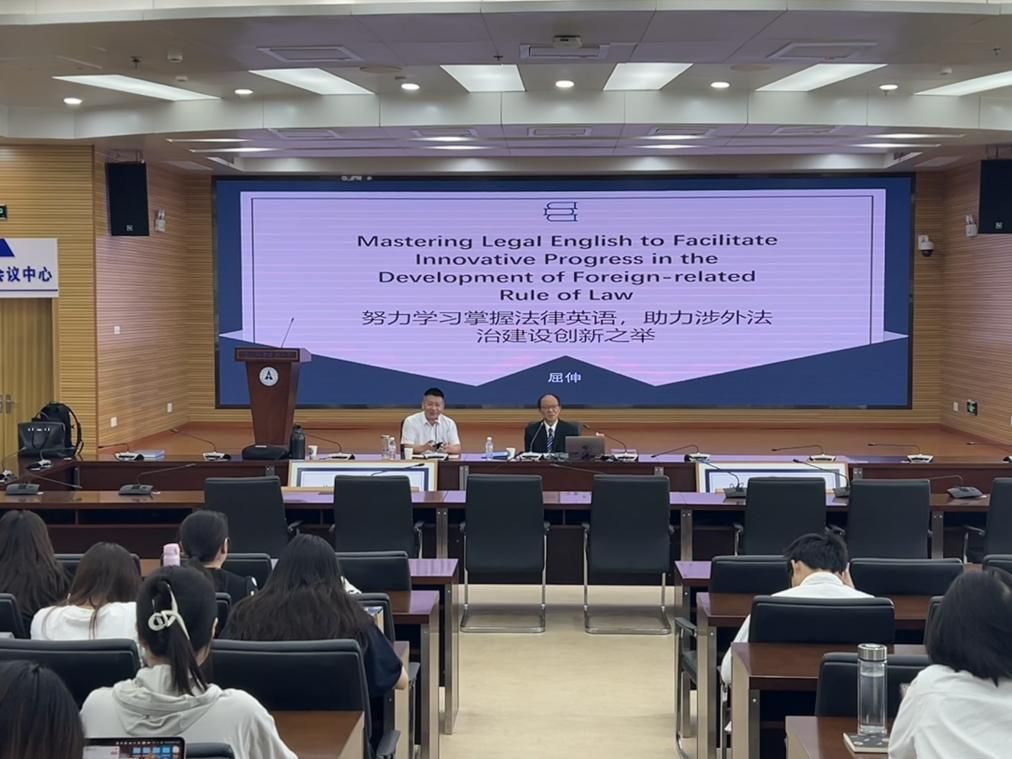 院网讯(通讯员:张云越 摄影:王一帆)5月30日上午,广东省高级人民法院外事处原主任、中国翻译协会理事、中国翻译协会涉外法治翻译与传播专委会委员、广东省翻译协会副会长、我校优秀校友屈伸法官应邀莅临我校,在南湖校区文澴同传会议室为师生开展了一场题为“努力学习掌握法律英语,助力涉外法治建设创新之举”的全英文学术讲座。讲座由学院翻译硕士导师组组长朱勇老师主持,学院部分教师和2024级全体翻硕研究生、法学院法律硕士涉外律师方向研究生参与讲座。