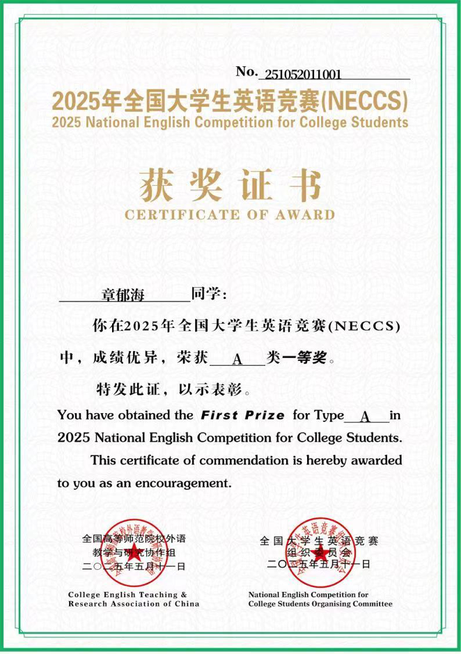 近日,2025年全国大学生英语竞赛(NECCS)获奖名单揭晓,学院王革教授指导的外国语言学及应用语言学专业硕士研究生章郁海同学继2024年获一等奖后,再次脱颖而出,荣获2025年全国大学生英语竞赛A类一等奖。