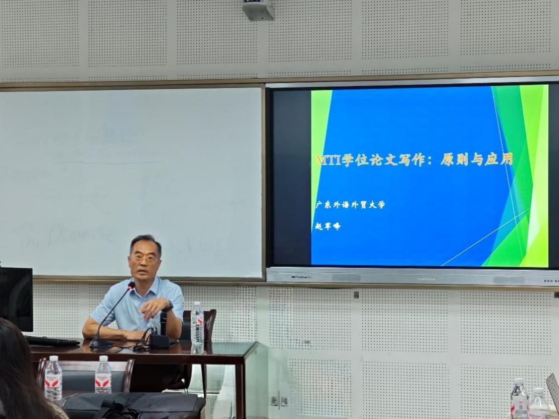 赵军峰教授首先解读了翻译专业学位建设的重要发展动向。他指出,翻译专业学位类别由硕士层次提升到博士层次,设置翻译专业博士学位(DTI),并将翻译专业学位类别由原来的附录形式呈现调整为与外国语言文学一级学科并列呈现,凸显两种类型人才培养同等重要地位。接着,赵教授深刻阐释了翻译硕士学位论文的基本要求、写作原则和具体应用,通过大量例证,探讨了不同类型MTI学位论文,尤其是实践成果类(案例分析报告、调研报告等)的具体写作规范与评价标准。