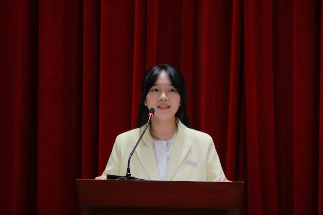 商务英语2201班陈婧希代表在校生发言。她结合自身经历,分享对“如何过好大学四年”的思考,并给出三点建议:一是认识自己、做好规划,主动打破信息差,制定长短期目标并定期复盘;二是坚持学习、保持思考,依托学院平台拓展能力边界;三是积极尝试、提升自我,主动参与学术研讨与兴趣活动。