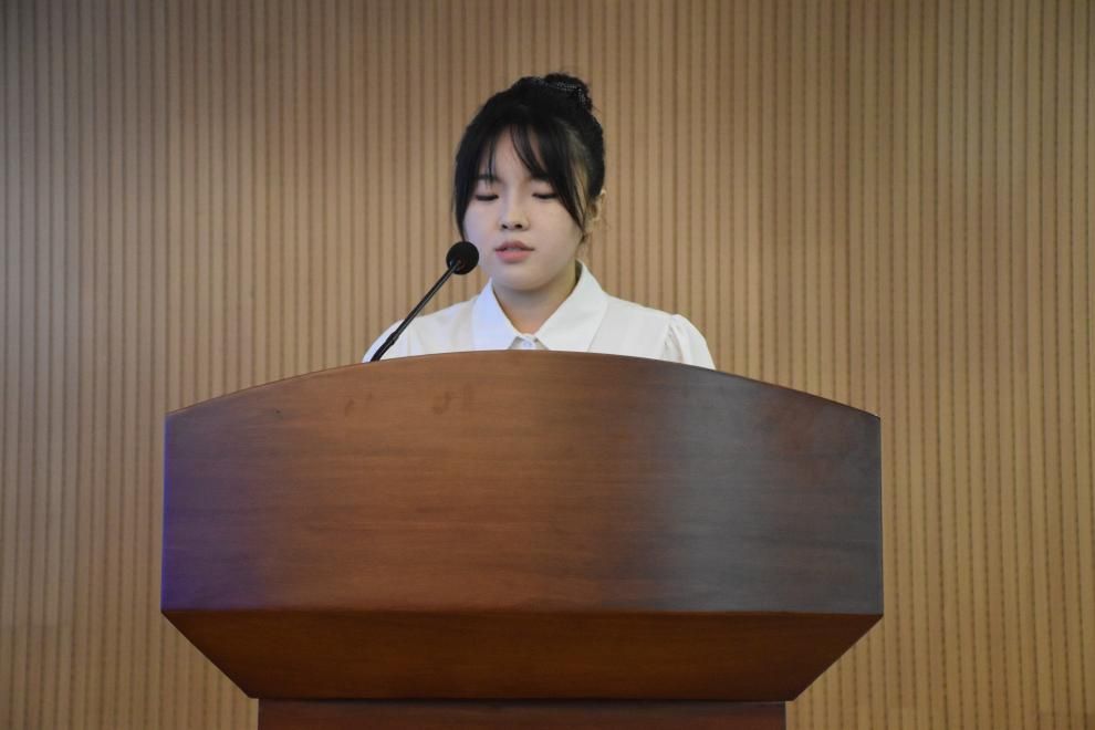 2023级国别与区域研究专业研究生杨吉悦、2025级英语语言文学专业研究生任飞羽分别作为在校生和新生代表发言。杨吉悦结合自身赴俄交流学习经历,介绍了学院“双轨并行”的国际交流机制与多元成长平台,鼓励新生们主动参与学术实践与国际项目,真正实现“外语+”复合型人才的成长目标。