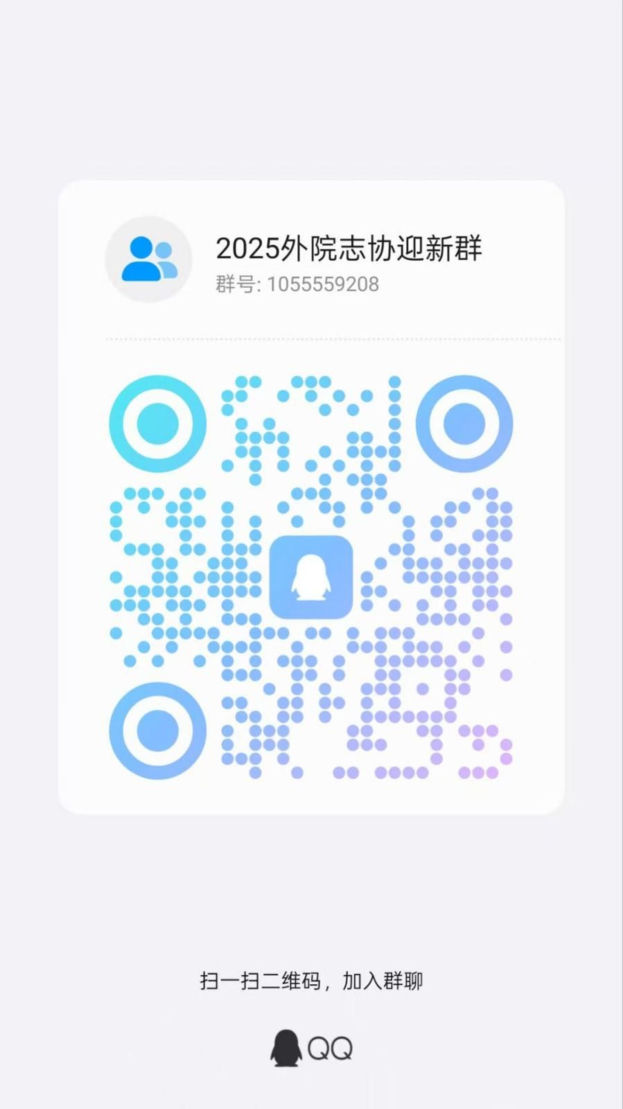 扫码加入我们的QQ招新群(群号:1055559208)了解更多信息,师兄师姐会热心解答你的所有疑问.开学后在线上或线下填写报名表,通过面试后即可成为外院志协的一员啦~