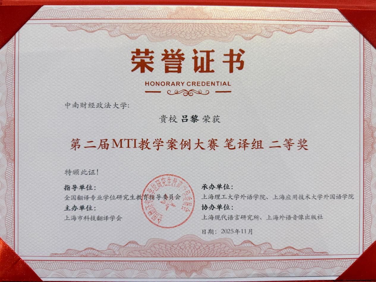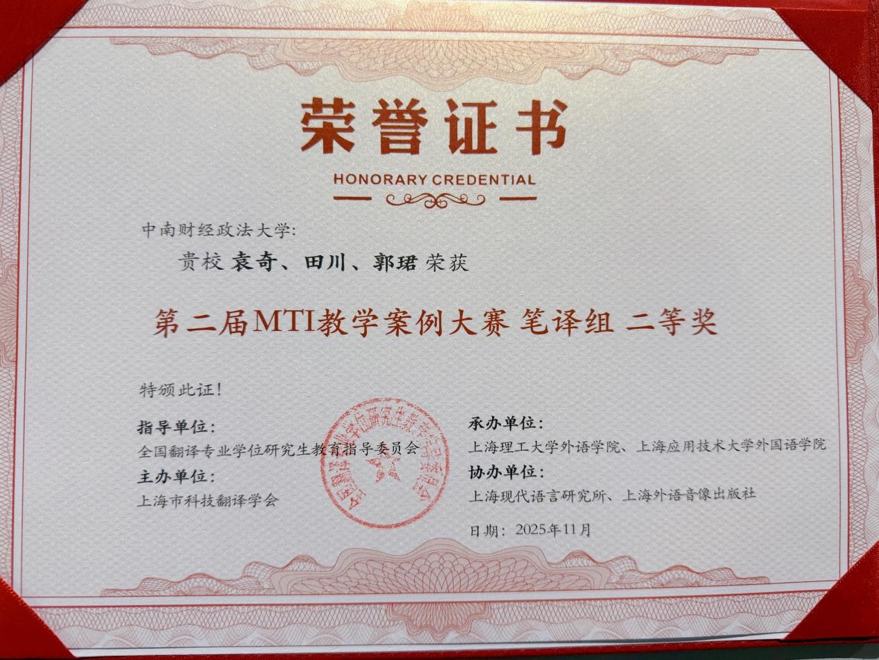 2025年11月1日,MTI案例教学研讨会暨“第二届MTI教学案例大赛”颁奖典礼在上海应用技术大学隆重举行。大赛由全国翻译专业学位研究生教育指导委员会指导,上海市科技翻译学会主办,旨在推动全国MTI教育高质量发展,促进教学改革与创新案例的交流共享。大赛共设笔译、口译、翻译技术、翻译项目管理四个组别,经过多轮专家评审,评选出一、二、三等奖及优胜奖。此次大赛吸引了来自全国122所MTI院校的227份教学案例参赛。经大赛评委会初评、复评,外国语学院袁奇教授团队申报的案例《讲好中国品牌故事:企业外宣文本汉英翻译》及吕黎老师申报的案例《聋人应急语言服务国际指南翻译教学案例》荣获笔译组二等奖。