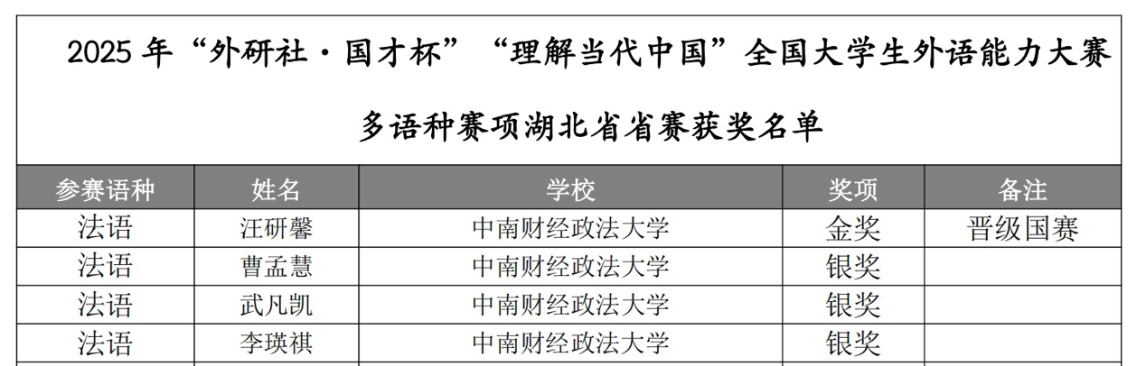 近日,从2025年“外研社·国才杯”“理解当代中国”全国大学生外语能力大赛湖北省省赛现场传来喜讯。经过与全省各高校优秀选手的激烈角逐,中南大法语系学子表现卓越,汪研馨(法语专业大四)凭借其出色的综合能力荣获金奖,晋级国赛,曹孟慧(法律(非法学)研一),武凡凯(法语笔译研二),李瑛祺(法语专业大四)同样发挥稳定,将银奖收入囊中,为学校赢得了荣誉。