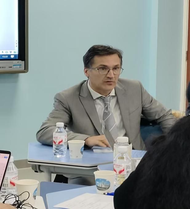 AZEMA 副教授介绍了该校双学位、硕士联合培养项目的核心架构,包括项目设立的国际教育背景、复合型人才培养目标、模块化课程设置逻辑、优质教学资源配置(含师资、科研平台)及毕业生国际升学 / 就业发展前景;同时分享了图卢兹一大的悠久办学历史、优势学科(尤其是法语教学、法学、经济、管理领域)的学术实力,以及多年来国际交流合作的成熟经验,为两校合作奠定坚实基础。